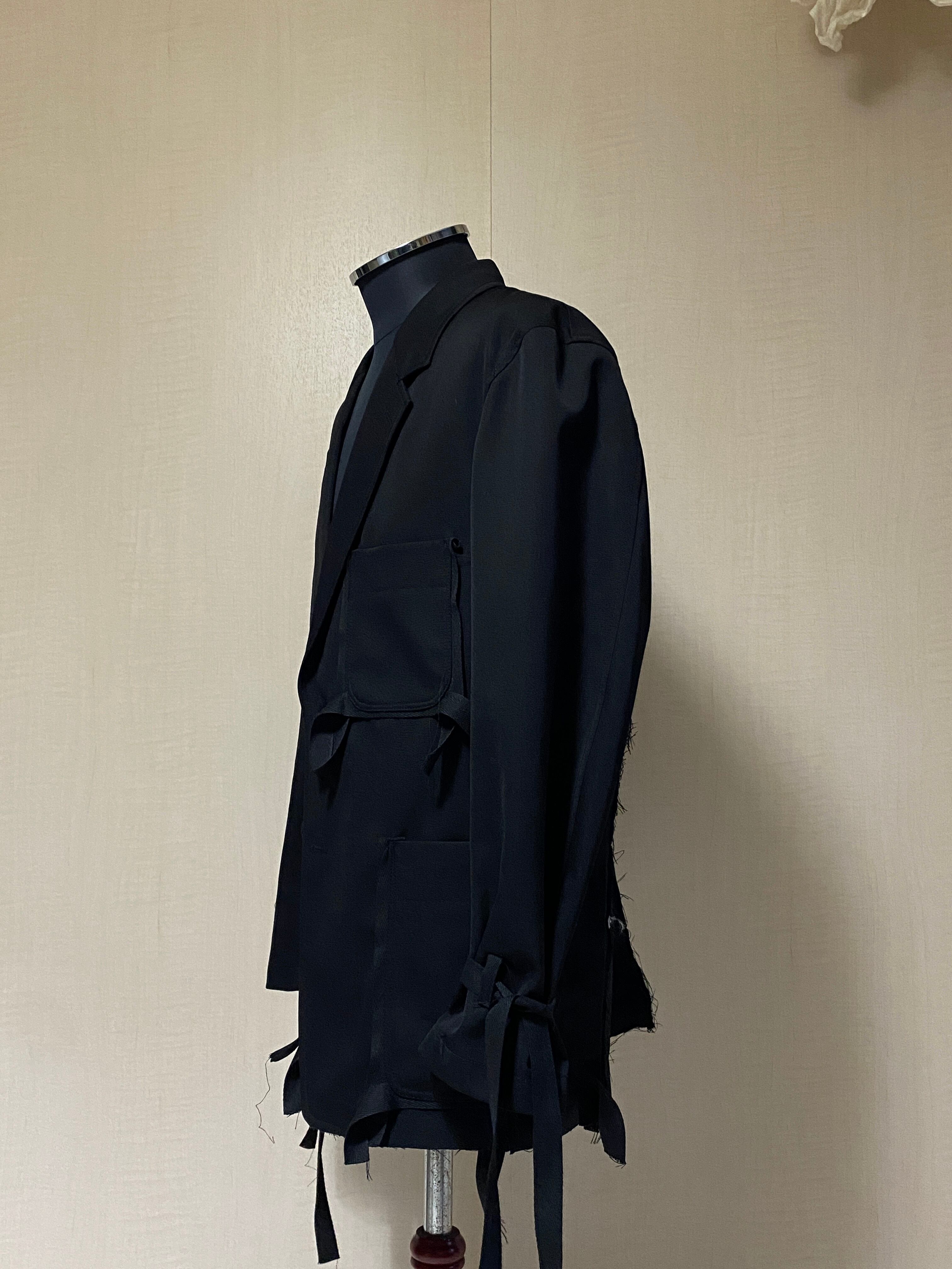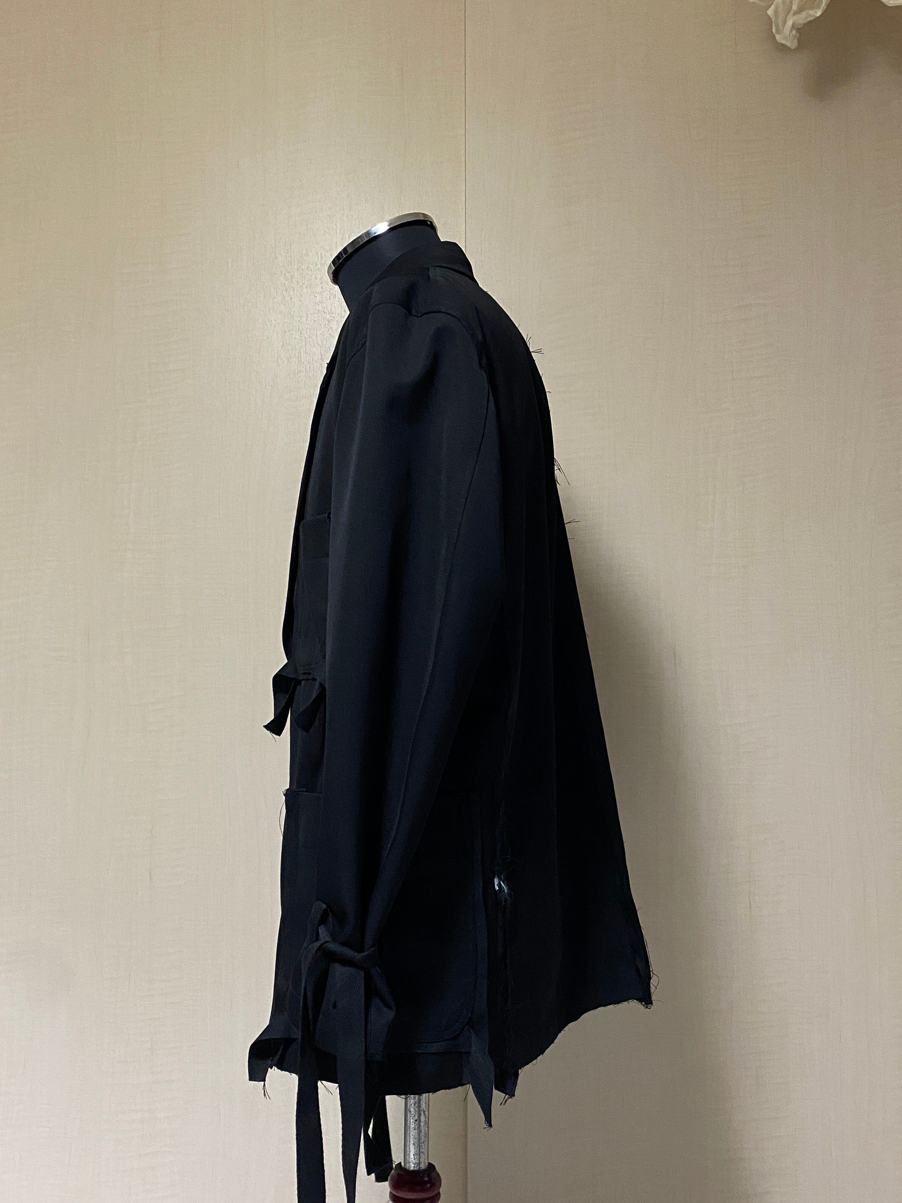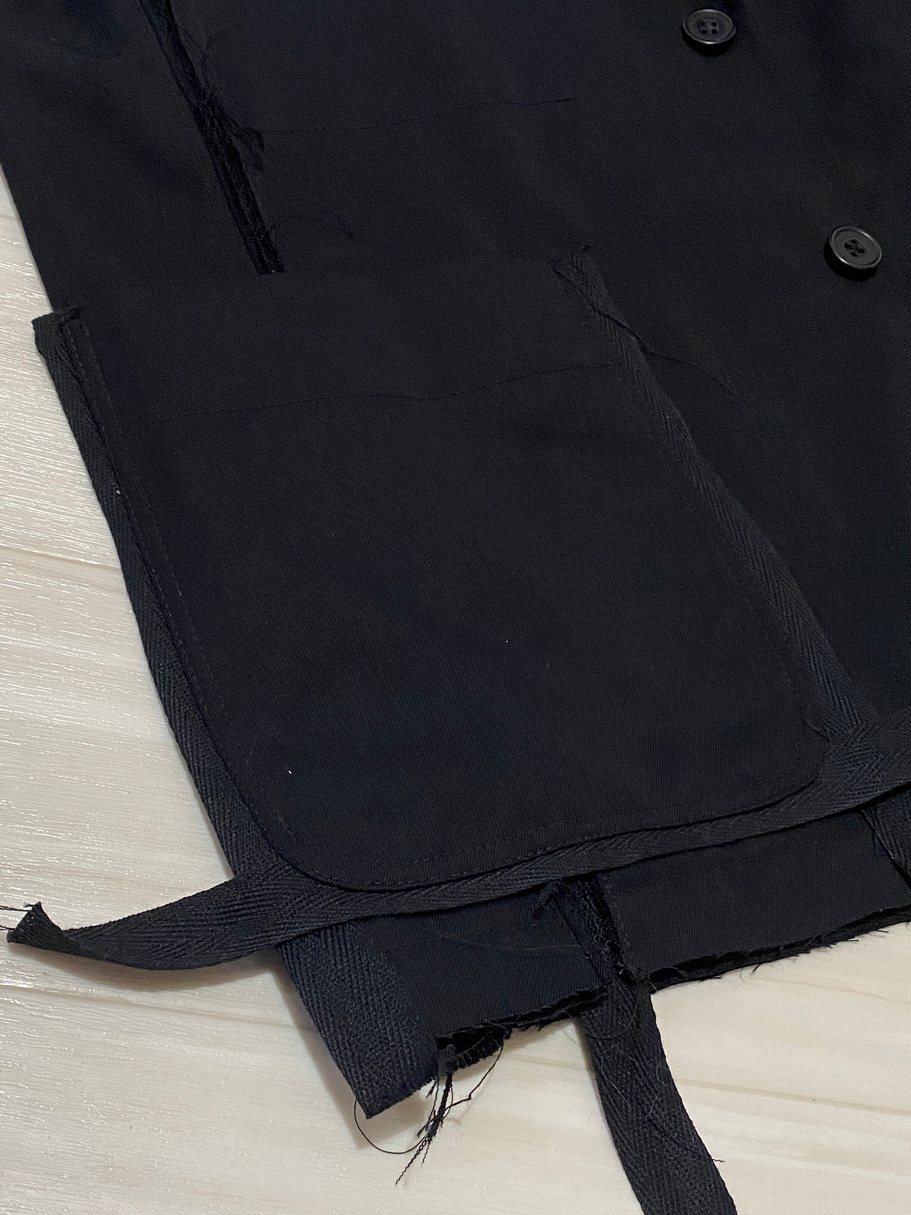光沢あるブラックギャバジンのカバーオールの縫い代を大胆にカットし
