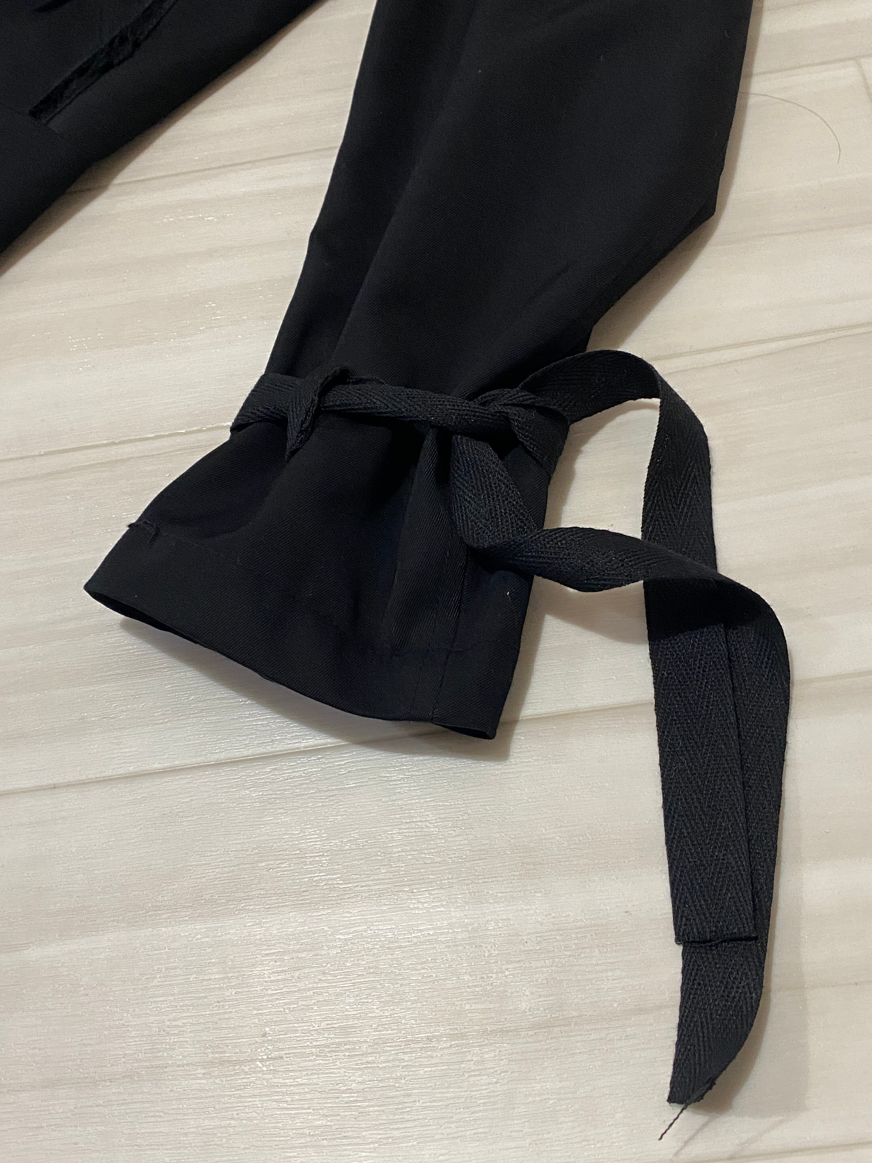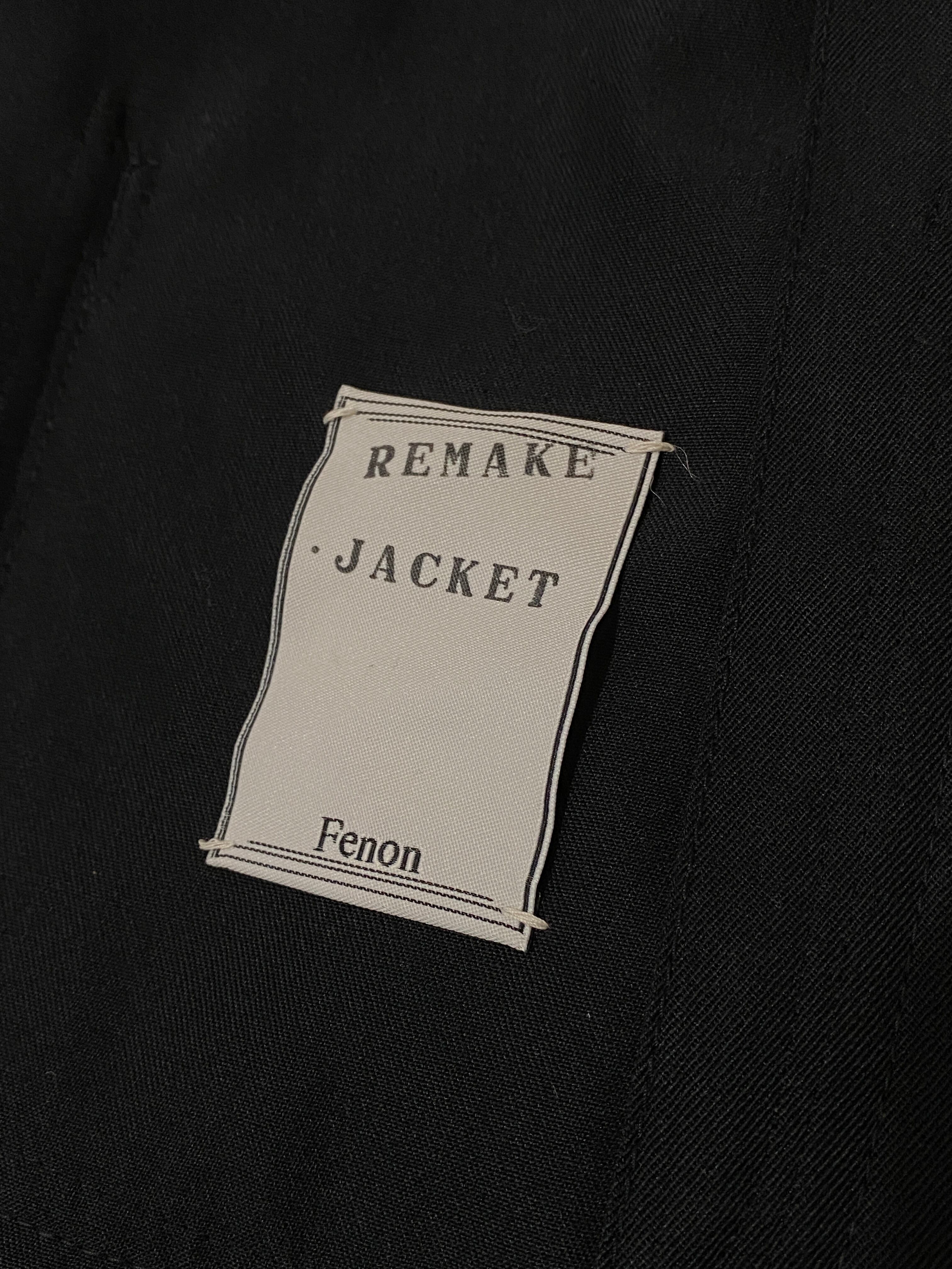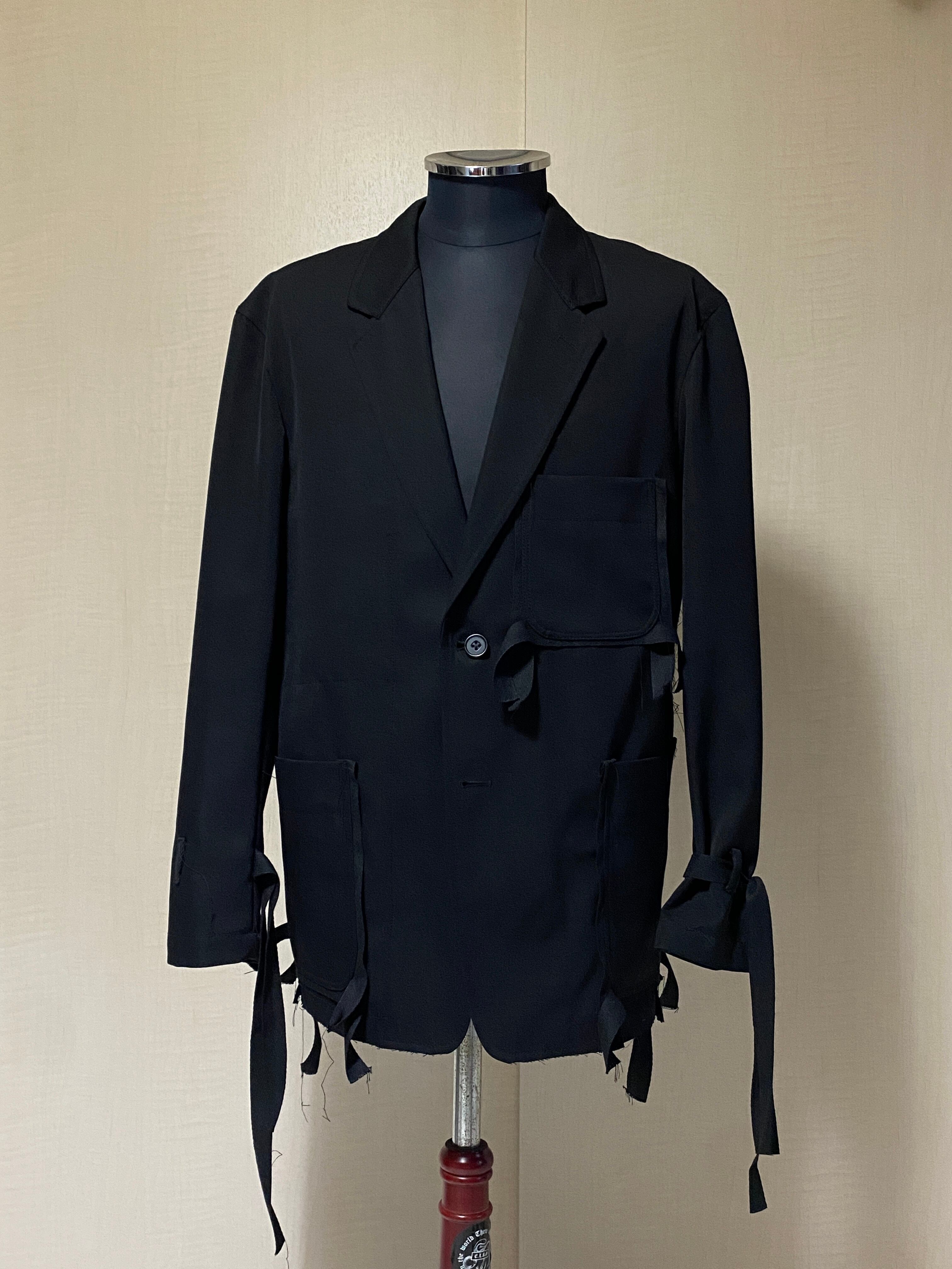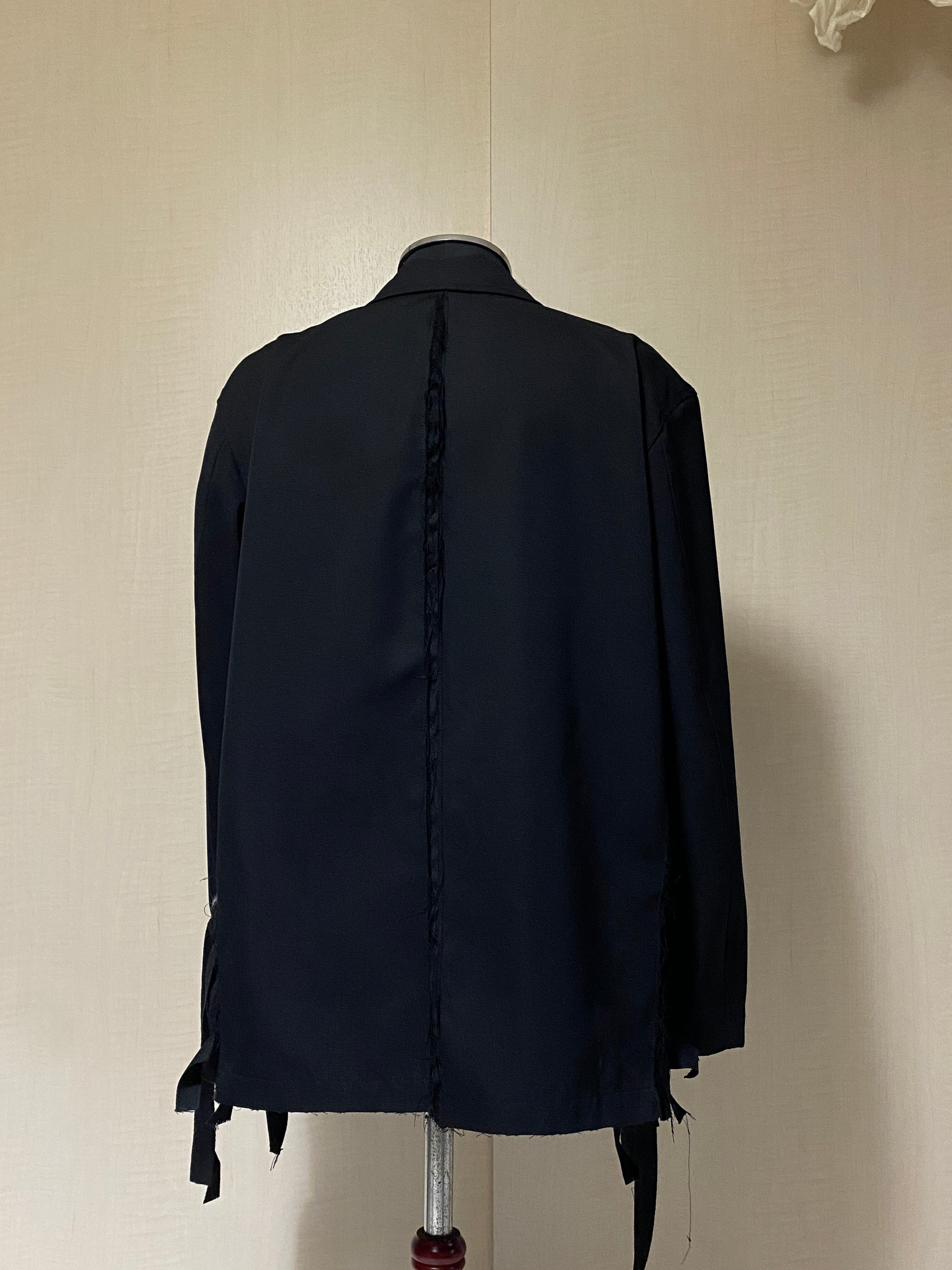 光沢あるブラックギャバジンのカバーオールの縫い代を大胆にカットし